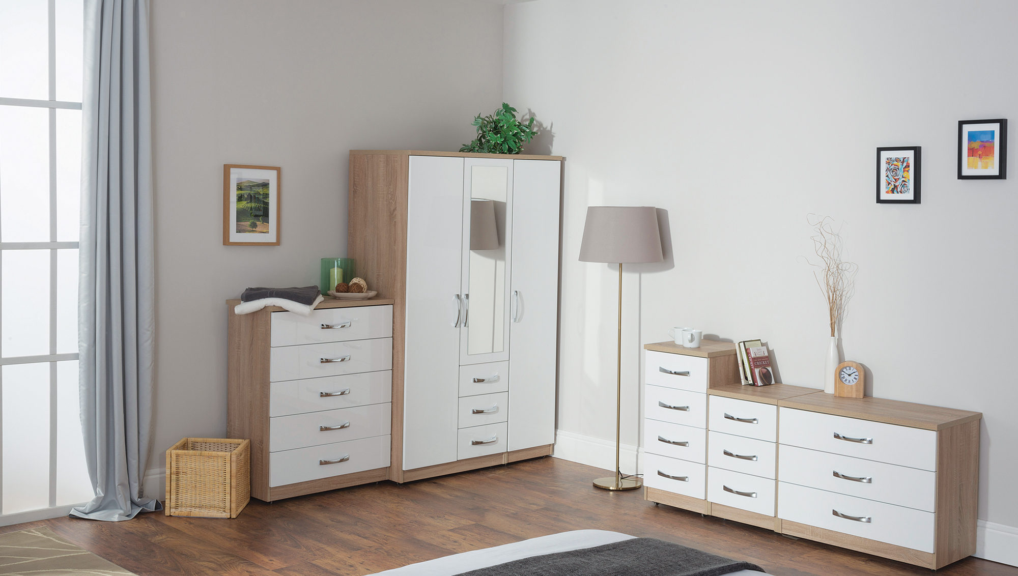 Versatile storage options can be combined to keep bedrooms clutter free and organised, from larger pieces such as wardrobes and units, to smaller pieces like bedside. 2 drawer engineered wood nightstand in oak structure/white gloss x 2 8 drawer double dresser in oak structure/white high gloss x 1. Vida living jenoah high gloss grey and oak furniture. 4.0 out of 5 stars 116. Seville bedroom furniture in light oak veneer/high gloss /red/grey/black and white browse by all 1 2 3 5 bed bedroom furniture bedside black cabinet chest chests door drawer drawers effect gloss grey high in light oak plus room set seville slim veneer wardrobe wardrobes white with drawers